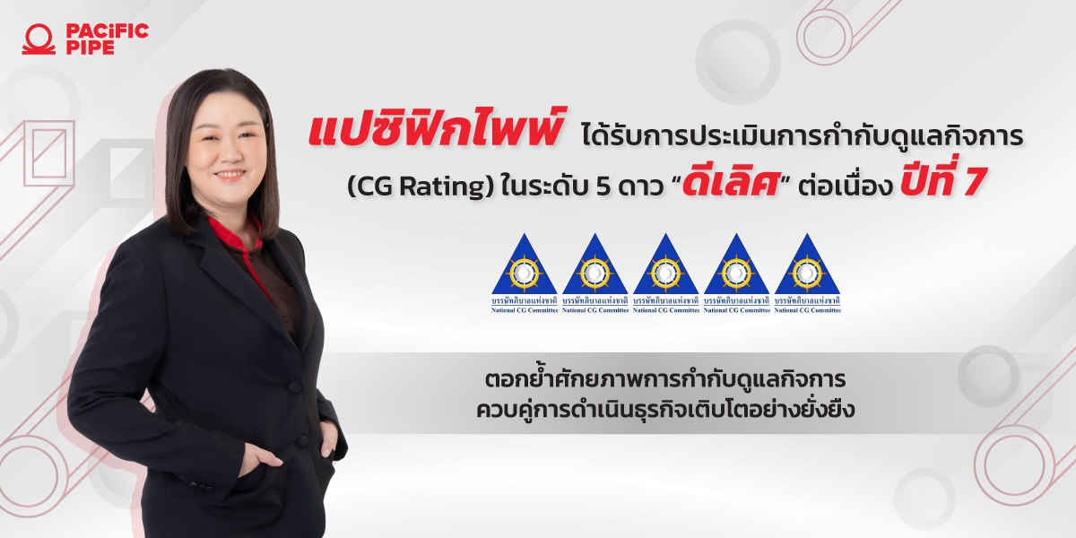 แปซิฟิกไพพ์ได้รับคะแนนการประเมินการกำกับดูแลกิจการ CG Rating ระดับ “5 ดาว – ดีเลิศ” (Excellent CG Scoring) ต่อเนื่องเป็นปีที่ 7 ซึ่งเป็นระดับสูงสุดจากสมาคมส่งเสริมสถาบันกรรมการบริษัทไทย (IOD) โดยได้รับการสนับสนุนจากตลาดหลักทรัพย์แห่งประเทศไทย