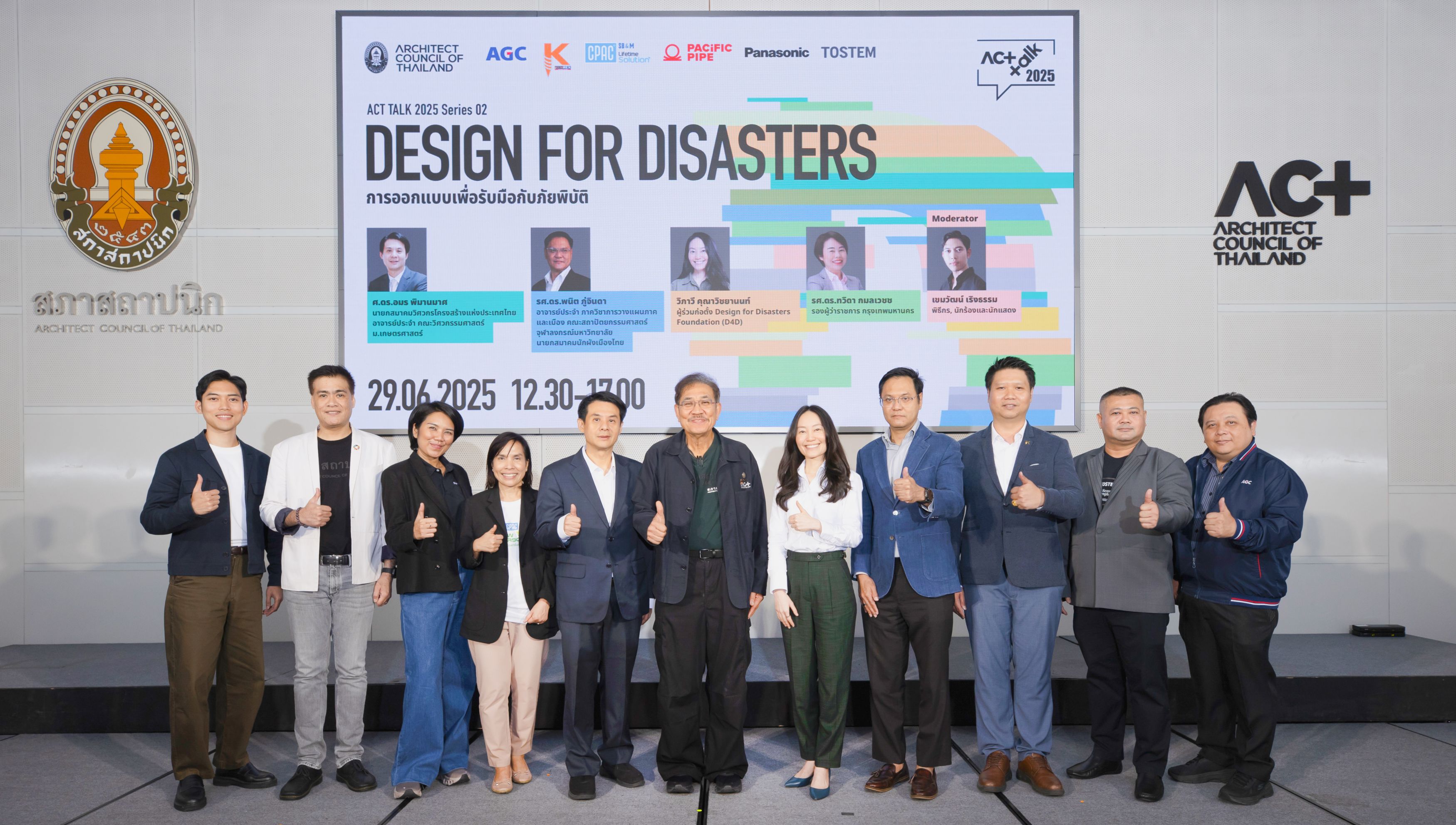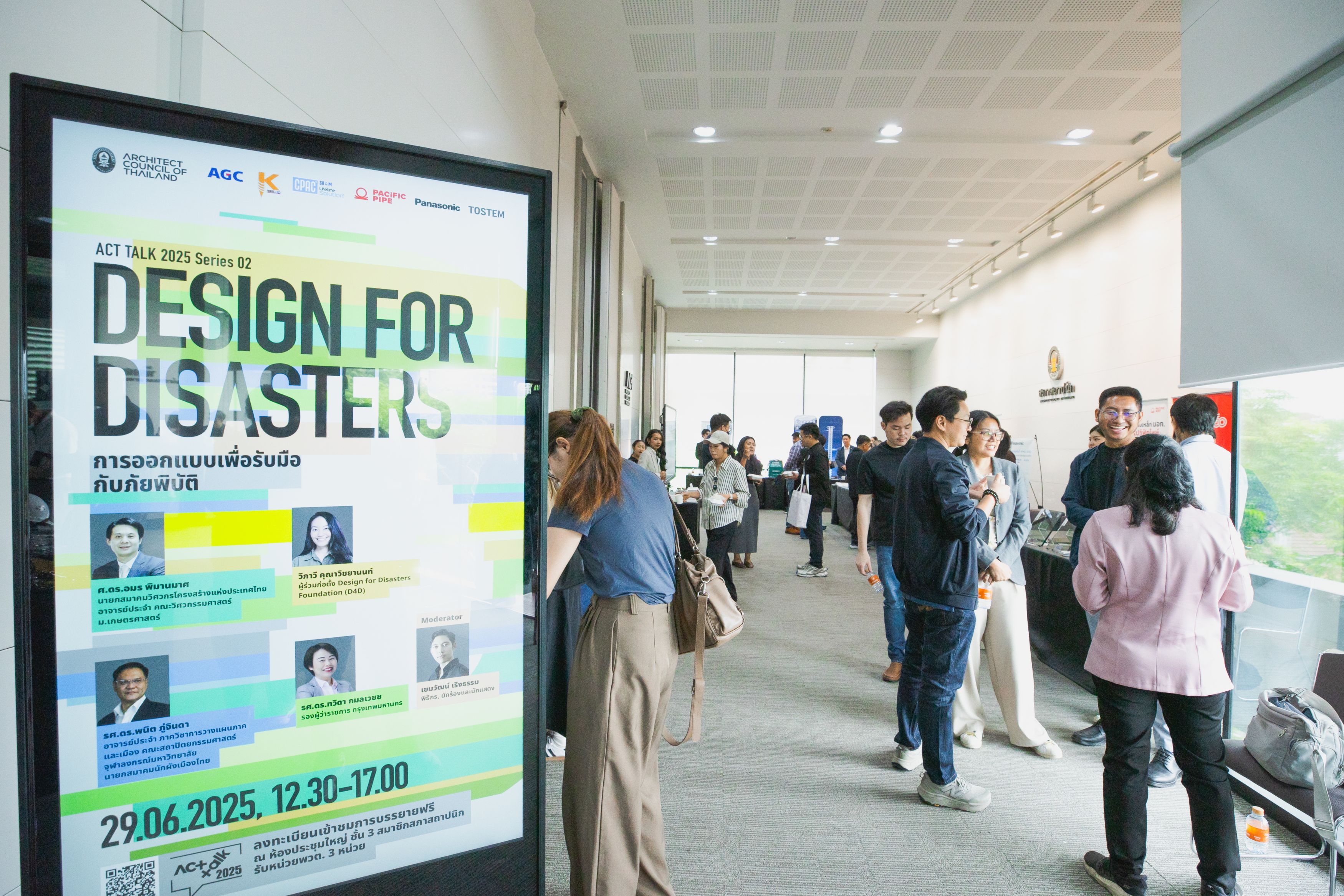 บรรยากาศงาน ACT TALK 2025 Series 02 ภายใต้หัวข้อ ‘DESIGN FOR DISASTERS – การออกแบบเพื่อรับมือกับภัยพิบัติ’ เมื่อวันอาทิตย์ที่ 29 มิถุนายน 2568 ณ ห้องประชุมใหญ่ ชั้น 3 สภาสถาปนิก ที่รวมตัววิทยากรผู้ทรงคุณวุฒิจากหลายสาขา มาแลกเปลี่ยนความรู้จากผู้เชี่ยวชาญหลายสาขา มาแลกเปลี่ยนมุมมองด้านการออกแบบ วางแผนเมือง การบริหารจัดการภัยพิบัติ และการรับมือกับวิกฤตในรูปแบบต่างๆ