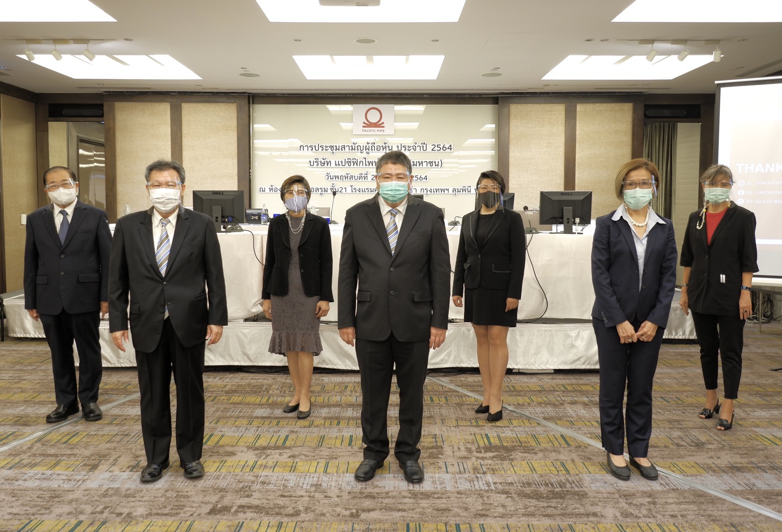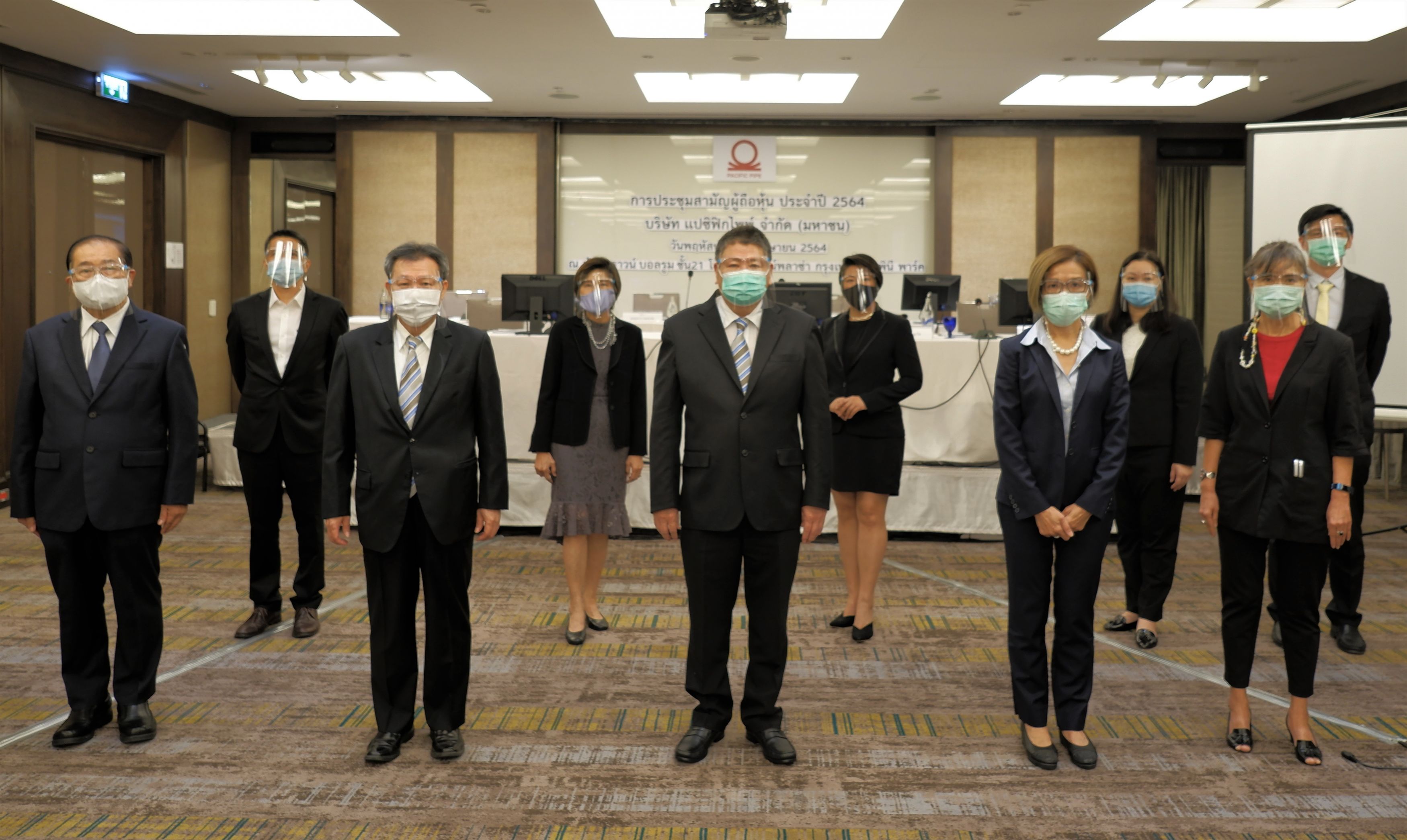 บริษัท แปซิฟิกไพพ์ จำกัด (มหาชน) หรือ PAP จัดประชุมสามัญผู้ถือหุ้นประจำปี 2564 นำโดย นายเกรียงไกร รักษ์กุลชน ประธานกรรมการบริษัทฯ (ยืนกลาง) นายสมชัย เลขะพจน์พานิช กรรมการบริษัทฯ (ที่ 2 จากซ้าย) นางเอื้อมพร ปัญญาใส ประธานเจ้าหน้าที่บริหาร(ที่ 2 จากขวา) พร้อมด้วยคณะกรรมการบริษัทฯ ผู้บริหารและพนักงานให้การต้อนรับพร้อมตอบข้อซักถามผู้ถือ เมื่อวันที่ 22 เมษายน 2564 ณ ห้องคราวน์ บอลรูม โรงแรม คราวน์พลาซ่า กรุงเทพฯ ลุมพินี พาร์ค