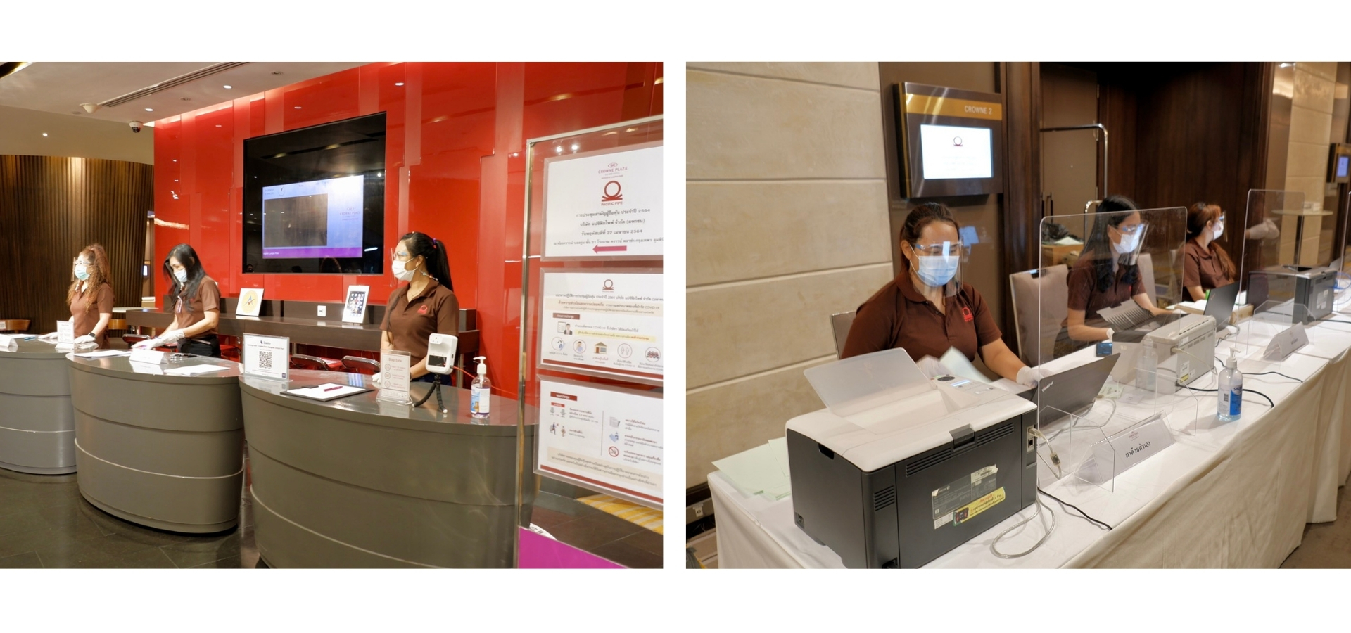 โดยก่อนเข้าพื้นที่ประชุม บริษัทฯ กำหนดให้มีการเช็คอิน-เช็คเอาท์ บนแอปพลิเคชันไทยชนะ จัดตั้งจุดตรวจวัดอุณหภูมิ พร้อมทั้งให้ผู้ถือหุ้นกรอกแบบคัดกรองโรคฯ และมีบริการจุดล้างมือด้วยเจลแอลกอฮอล์ ตามมาตรการป้องกันความเสี่ยงอย่างเคร่งครัด